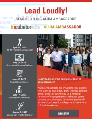 Register for the Information Session Webinar on May 21, 2025, at 7:00 PM Central. This webinar is designed for INCubatoredu alumni who wish to give back, develop their leadership skills, and remain connected to a national network of changemakers. Those who are both curious and committed are invited to attend so their questions can be answered. Cannot attend live, but still want to learn more? Use the same link to register and receive the recording after the live event.