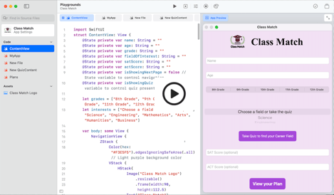 - "Class Match solves a specific problem with an intuitive design. You demonstrated a good understanding of user needs and Swift coding concepts. The code effectively uses various SwiftUI views, conditional logic, and modifiers to create a pleasing interface. Great work!"
