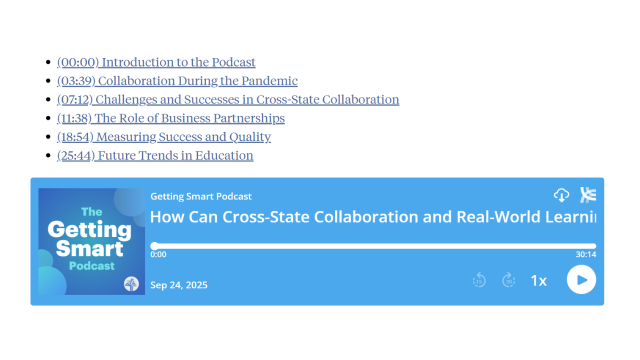 On this episode of the Getting Smart Podcast, Rebecca Midles sits down with Dr. Bill Nicely, Educator in Residence at the Ewing Marion Kauffman Foundation, to explore how cross-state, cross-sector collaboration in Kansas City is transforming education. They discuss the Real World Learning Initiative, the importance of market value assets for students, and how partnerships between urban, suburban, and rural districts are creating equitable opportunities. Tune in to learn how this innovative approach is preparing students for the future of work and fostering systemic change in education.